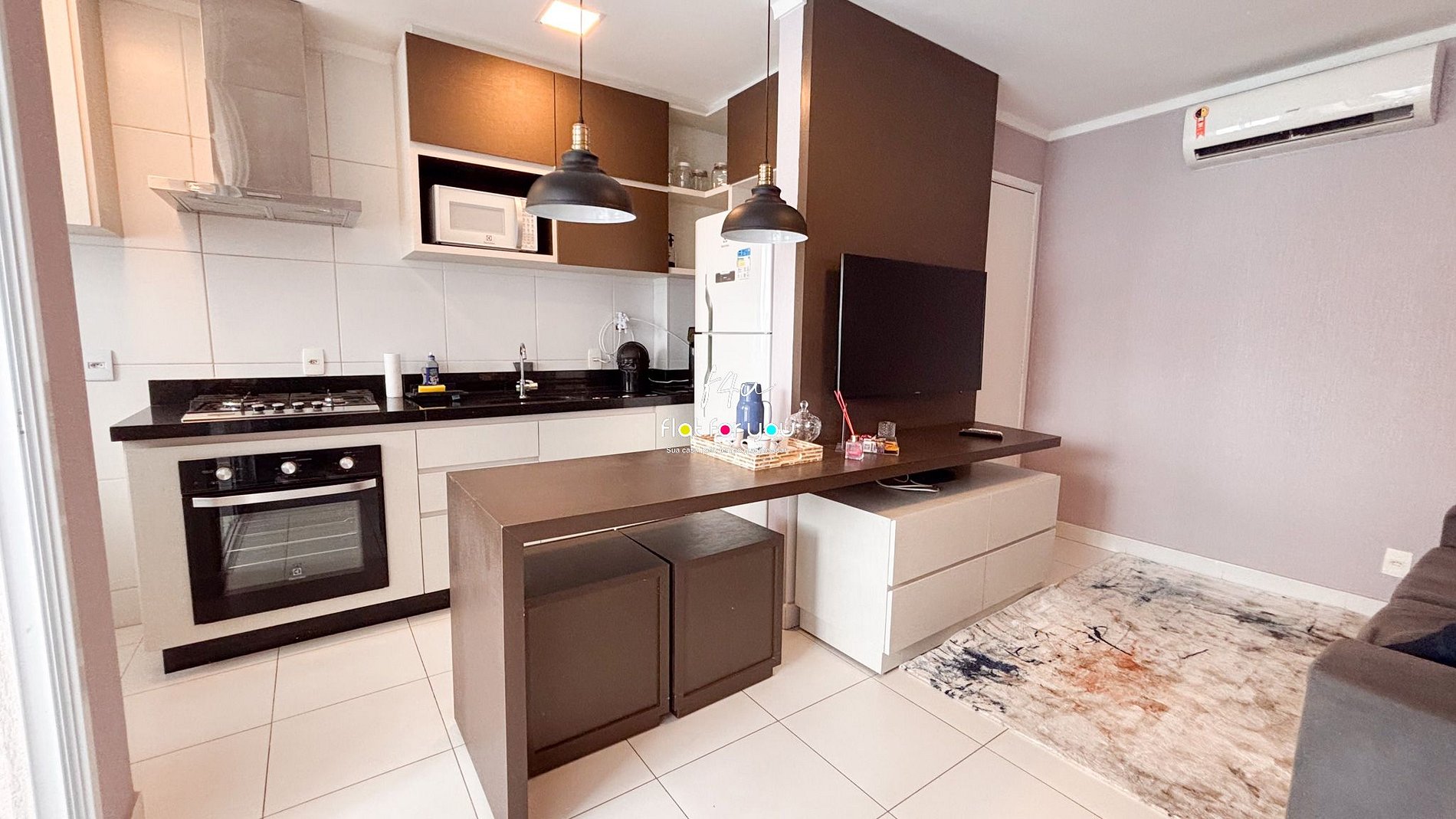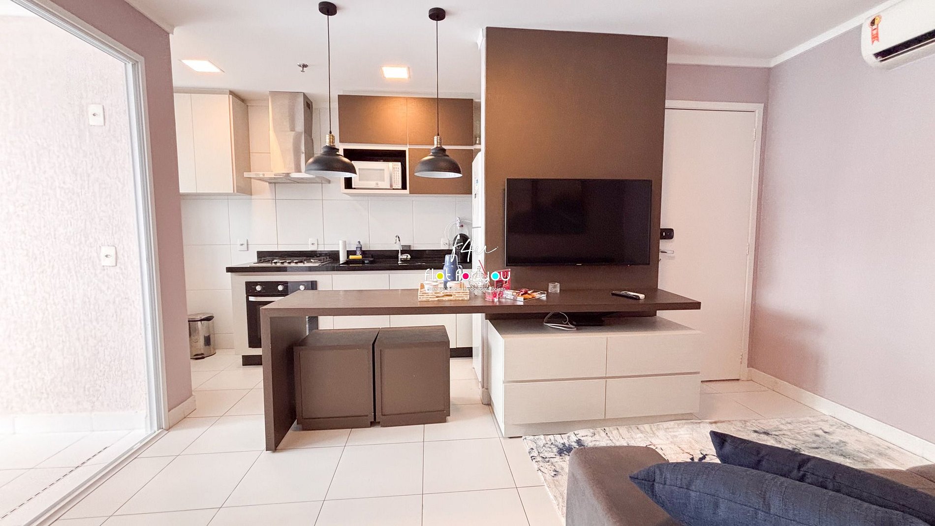 Apartamento de 2 quartos , dispõe de uma sala espaçosa, cozinha e área de serviço. Está 100% mobiliado e decorado . Armários planejados em todos os ambientes, ar condicionado nos quartos e na sala. Sala de estar possui sofá, TV , além de uma varanda para apreciar a vista . Comporta até 4 pessoas, sendo 1 quarto de casal e outra de solteiro com bi-cama. Cozinha equipada, possui geladeira, fogão cooktop, liquidificador , Airfryer, utensílios de uso diário e ainda área de serviço com tanque.